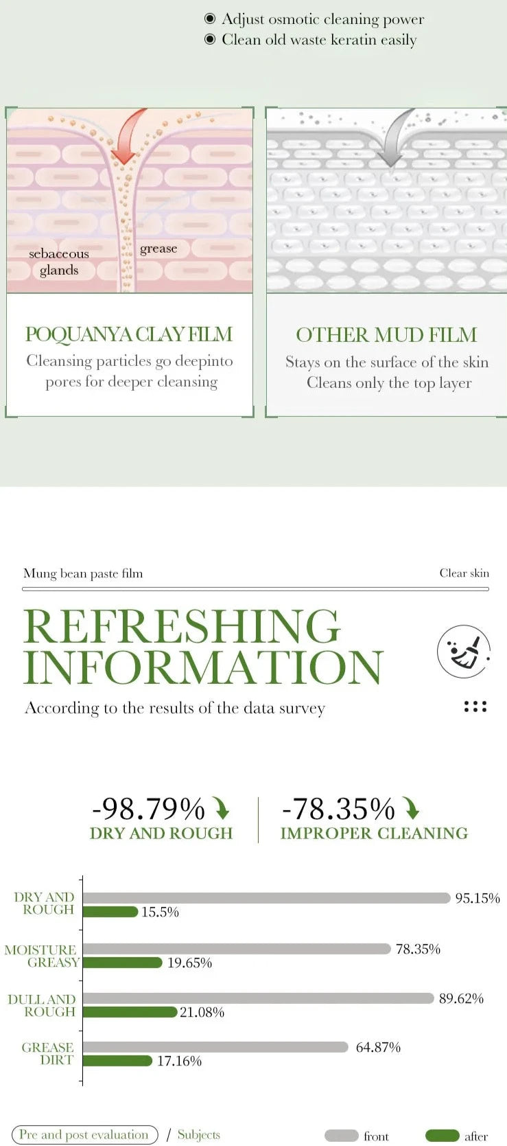 🌟 Deep Cleansing Power: Say goodbye to surface-level cleansing. Our Mung Bean Clay Mask penetrates deep into your pores, effectively removing dirt, oil, and residual makeup. It targets common skin issues like clogged pores, excessive oil secretion, and coarse texture, ensuring your skin feels clean and smooth.