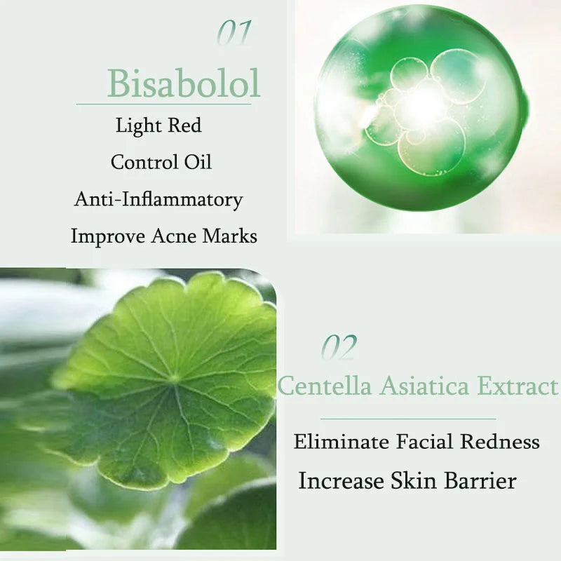 - Bisabolol: Reduces redness, controls oil, and improves acne marks.